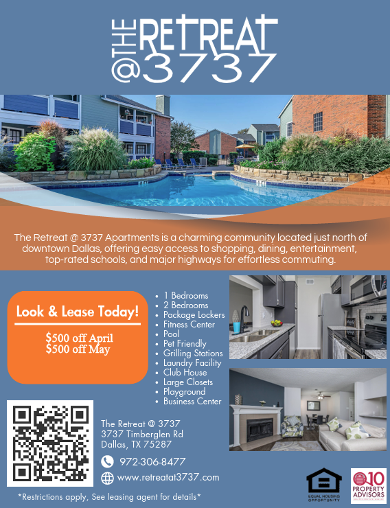 The delightful community at The Retreat @ 3737 apartment homes in Dallas, Texas, resides north of downtown. This exceptional community provides convenient access to great shopping, delicious dining, irresistible entertainment venues, and the Carrollton-Farmers Branch School District. Proximity to the President George Bush Turnpike and the Dallas North Tollway ensures easy access to explore the many wonders this region has to offer. Your future begins here at The Retreat @ 3737.