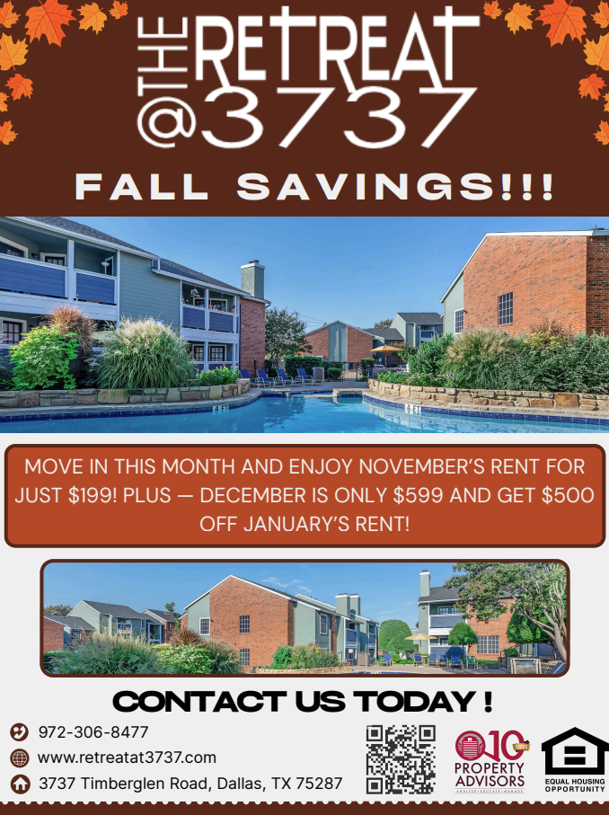 The delightful community at The Retreat @ 3737 apartment homes in Dallas, Texas, resides north of downtown.ย This exceptional community provides convenient access to great shopping, delicious dining, irresistible entertainment venues, and the Carrollton-Farmers Branch School District. Proximity to the President George Bush Turnpike and the Dallas North Tollway ensures easy access to explore the many wonders this region has to offer. Your future begins here at The Retreat @ 3737.